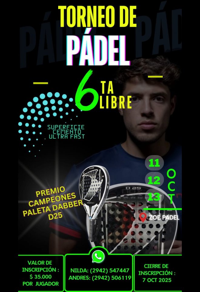 »» Evento: TORNEO de PADEL - C6 - ZAPALA »» Localidad: Aranguren | Zapala »» Fechas: 10/10/2025 al 13/10/2025