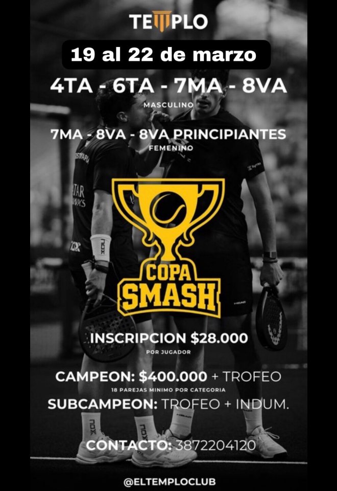 »» Evento: Templo - Copa Smash »» Localidad: General Güemes (Est. Güemes) »» Fechas: 19/03/2026 al 22/03/2026